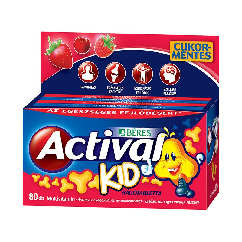A természetes aromával készült, és sztíviával (szetviol-glikozidokkal) is édesített Actival Kid rágótabletta nemcsak cukormentes és finom, hanem benne lévő összetevők közül a cink, a szelén, a réz, a vas, a folsav, az A- B6-, B12-, D- és C-vitamin hozzájárulnak az immunrendszer megfelelő működéséhez.Hozzájárulnak az immunrendszer megfelelő működéséhez: A-, B6-, B12-, C-, D3-vitaminok, folsav, réz, vas, szelén, cink. A gyermekek csontjainak megfelelő növekedéséhez és fejlôdéséhez szükség van: kalciumra és D-vitaminra. Elősegíti a gyermekek megfelelő növekedését: jód. Elősegíti a gyermekek kognitív képességének fejődését: vas.