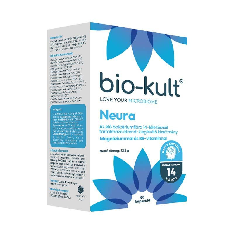 A Bio-Kult Neura élő baktériumtörzseket tartalmaz az egészséges ember emésztőrendszerében természetesen jelenlévő bélflóra kiegészítésére. A Bio-Kult Neura B6-vitamint és magnéziumot tartalmaz, melyek egyaránt hozzájárulnak a központi idegrendszer normál működéséhez. A magnézium és a B6-vitamin hozzájárul a fáradtság csökkentéséhez és a normál pszichológiai funkciókhoz. A B6-vitamin további előnye, hogy hozzájárul a normális hormonális aktivitás szabályozásához.