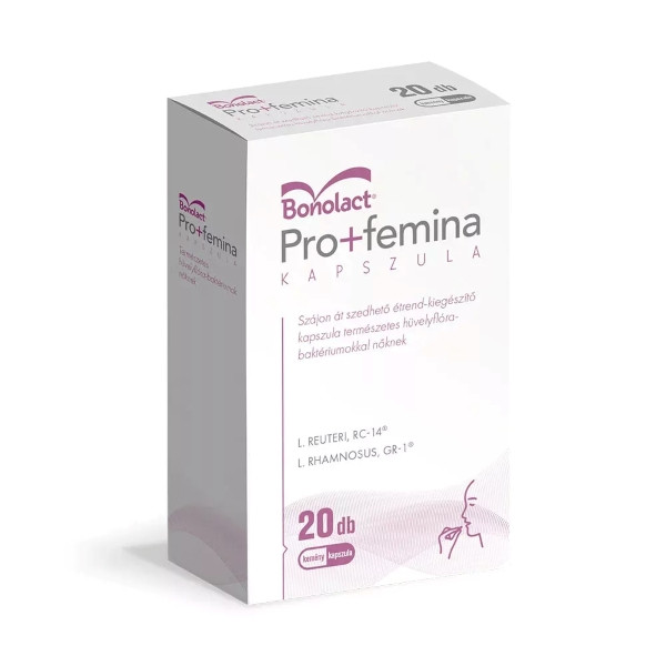 Speciális, szájon át szedhető élőflórás készítmény nőknek a természetes, egészséges hüvelyflóra fenntartásáért.A Bonolact® Pro+femina probiotikum kapszula hatását klinikai vizsgálatok igazolják, ugyanis speciális tulajdonságai alapján kiválasztott Lactobacillus rhamnosus, GR-1® és Lactobacillus reuteri, RC-14® probiotikus baktériumokat tartalmaz, kapszulázott formában. Ezek a baktériumok általában jelen vannak a nők egészséges hüvelyflórájában és különösen alkalmasak a hüvelyben való megtelepedésre.