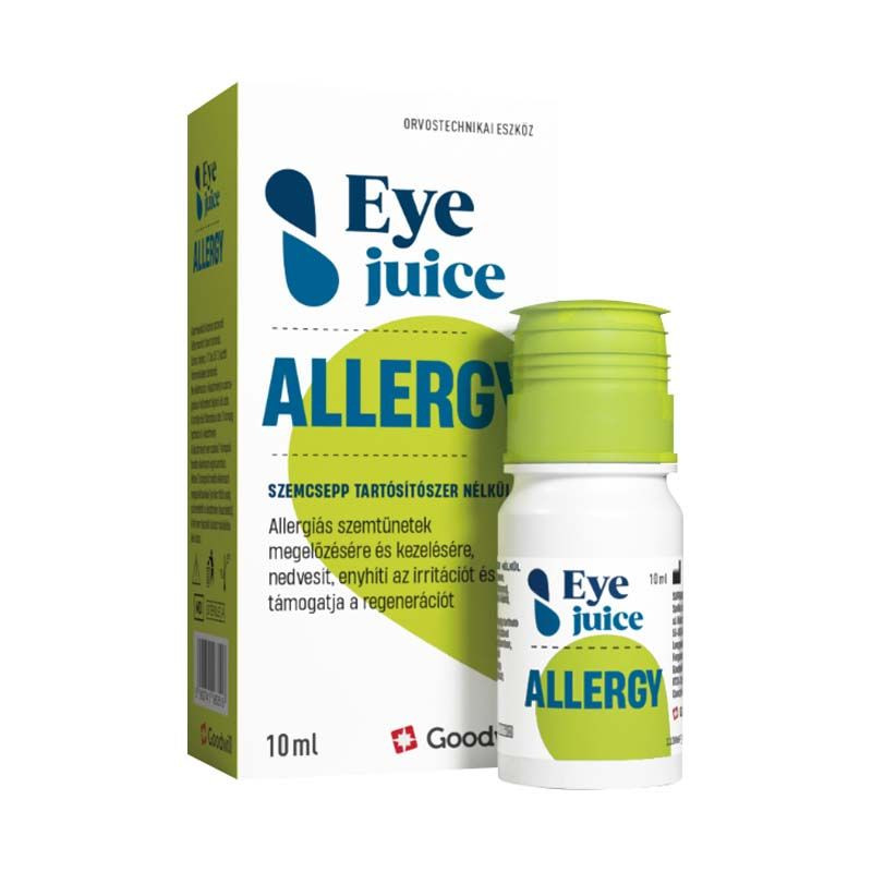 Az Eyejuice Allergy szemcsepp allergének, például pollen, házi poratka, állatszőr vagy penész kiváltotta szemirritáció esetén alkalmazandó.A négy hatóanyag egyedülálló kombinációját tartalmazó szemcsepp erőteljesen nedvesíti a szemgolyót és gyorsan csillapítja az allergiás kötőhártya-gyulladás zavaró tüneteit (például a szem kivörösödése, viszketése, égő érzése vagy könnyedzése).