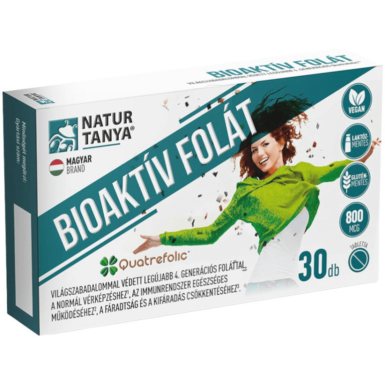 A Natur Tanya Bioaktív Folát étrend-kiegészítő tabletta világszabadalommal védett, legújabb 4. generációs Quatrefolic® foláttal, amely hozzájárul a normál vérképzéshez, az immunrendszer egészséges működéséhez, a fáradtság és a kifáradás csökkentéséhez.