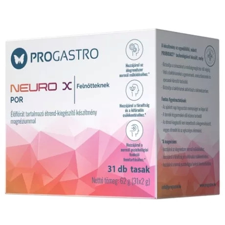Progastro Neuro X élőflórát tartalmazó étrend-kiegészítő készítmény magnéziummal, amely hozzájárul az idegrendszer normál működéséhez, a fáradtság és a kifáradás csökkentéséhez, valamint a normál pszichológiai funkció fenntartásához.