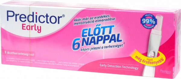A Predictor Early-vel már 6 nappal az esedékes menstruáció elmaradása előtt megtudhatja, hogy terhes-e. Klinikai vizsgálatok szerint a terhes nők 76%-ánál már elég magas a hCG hormonszint 6 nappal az esedékes menstruáció elmaradása előtt ahhoz, hogy kimutatható legyen. Laboratóriumi vizsgálatok szerint a teszt 99% feletti pontossággal állapítja meg a terhességet az esedékes menstruáció első napjától. Használata egyszerű és higiénikus.