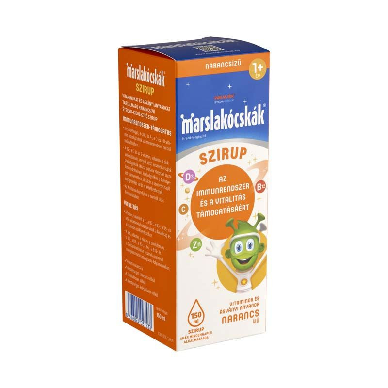 A kellemes narancsízű Marslakócskák szirup multivitamin készítmény már 1 éves kortól ajánlott az egészséges fejlődésért, az immunrendszer és a vitalitás támogatásáért.